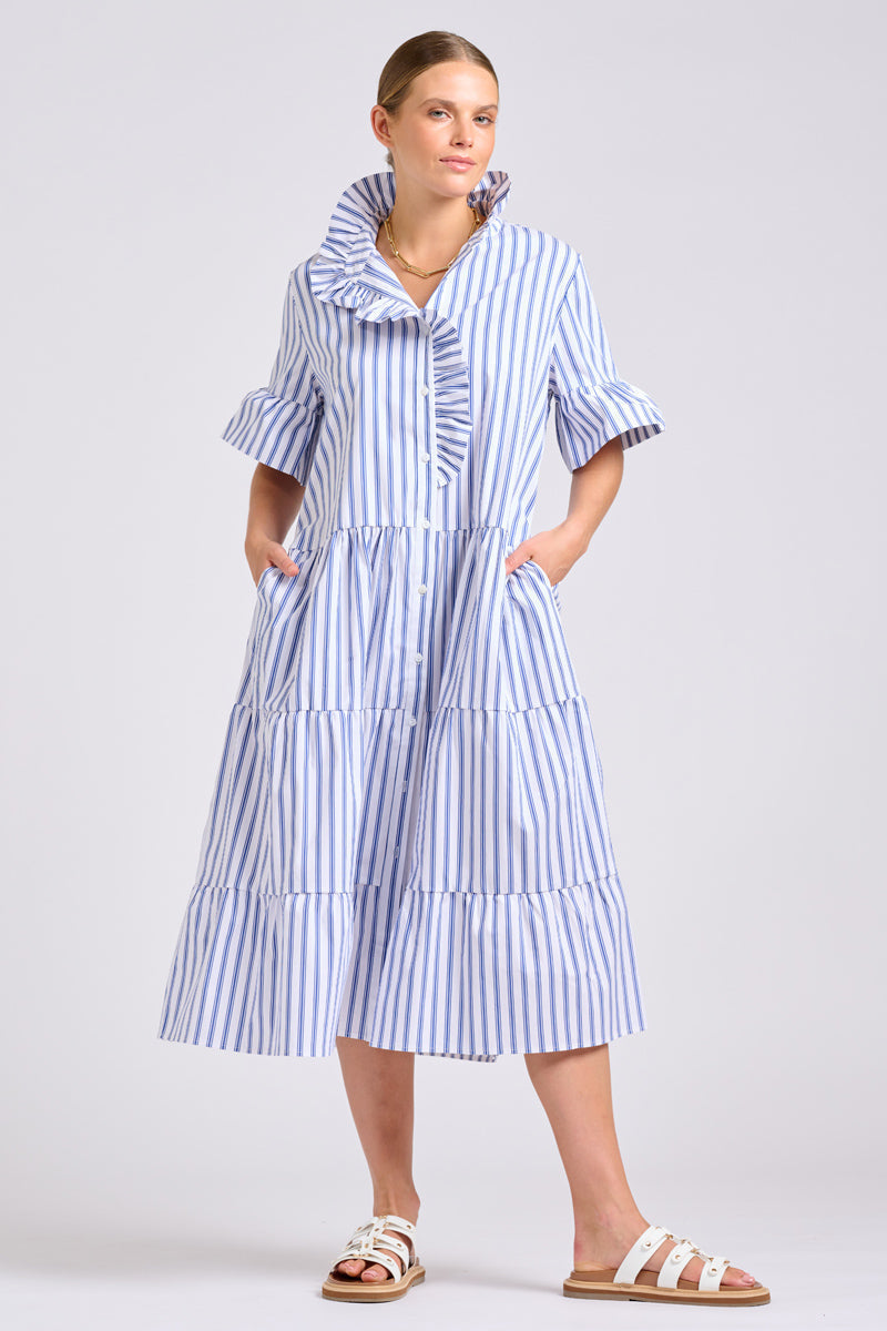 Meet Molly she’s all about details. Midi length button through dress featuring tiered skirt with feminine frill at collar, placket and sleeves, side pockets & self-belt. She’s a true lady, stylish & classic.