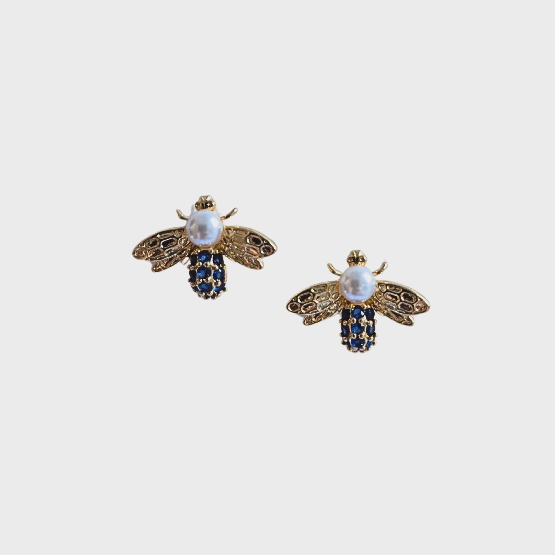 These little bee earrings are so sweet! Crafted from enamel and encrusted with navy diamantes and a pearl on a stud backing.