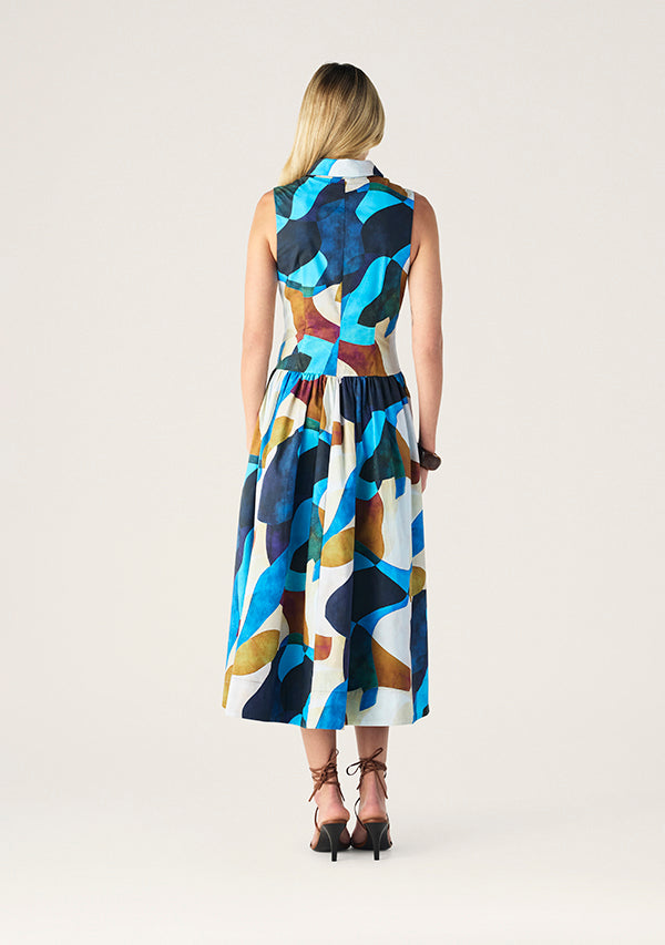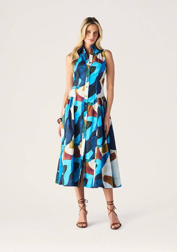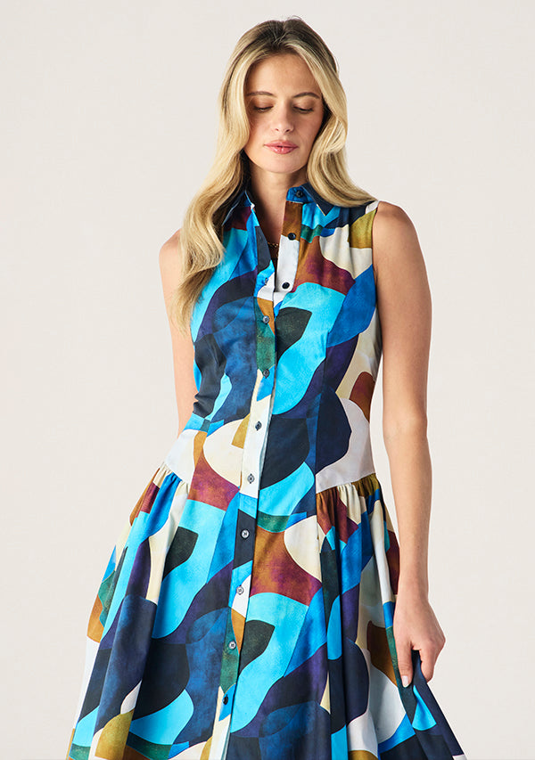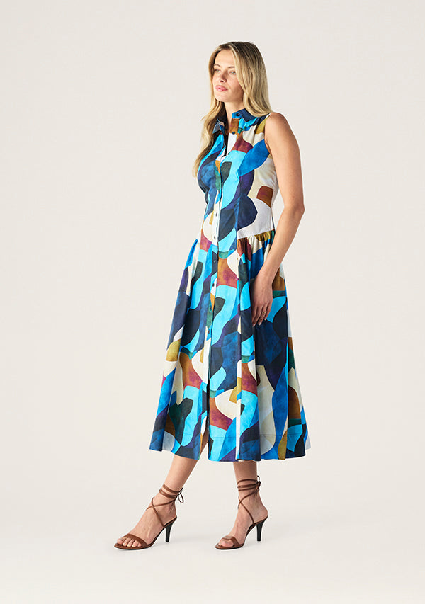 Bringing bold colour to classic tailoring, the Celestia Midi Dress is a fresh, feminine piece made for sunlit days and leisurely evenings. Cut from crisp cotton poplin, this sleeveless silhouette features a collared neckline and full button-through front for a polished finish. A fitted bodice flows into a softly gathered skirt, while the vivid abstract print adds a vibrant edge to this timeless shape. Style it with sandals for daytime or heels for a warm-weather event.