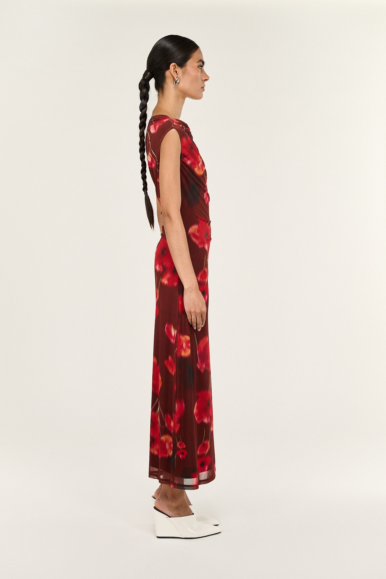The Vivi Red Poppy Print Off Shoulder Mesh Midi Dress is this season's statement piece. Crafted in a sheer mesh fabrication layered with a soft lining, it features an asymmetric neckline that folds elegantly across the shoulders, creating soft ruching through the bodice. The fluid midi-length skirt skims the body for a flattering, elongated finish, while the painterly floral print brings depth and movement. Style with minimal heels and sculptural jewellery for elevated evening moments.
