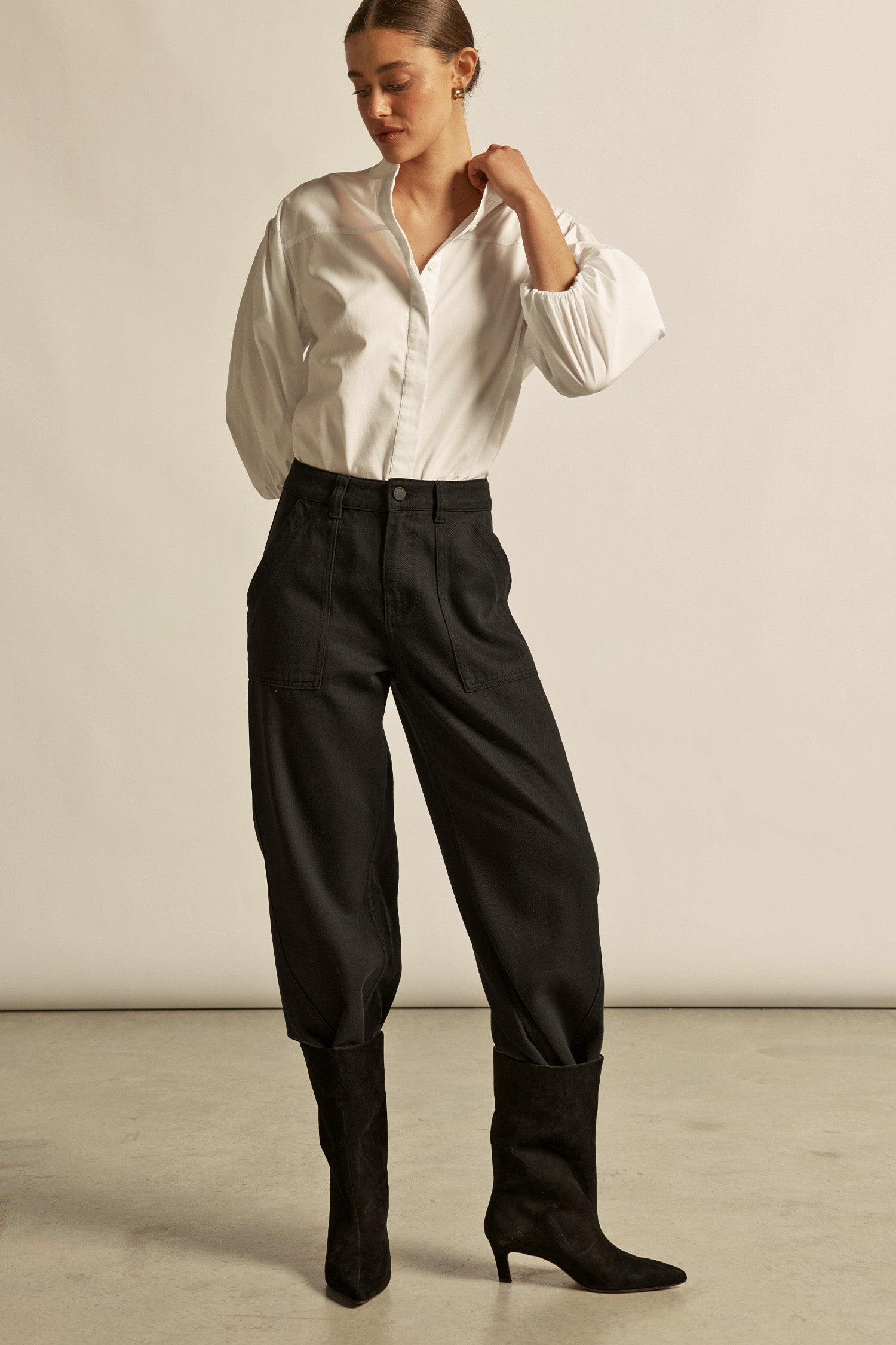 • buttoned hem for optional barrel-leg styling