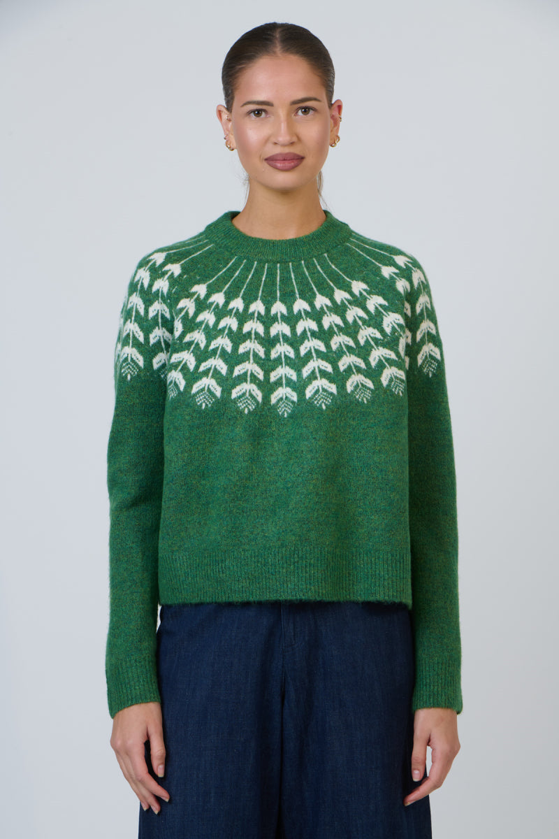 Fresh, cosy and effortlessly elevated — this emerald green knit is a modern take on a timeless classic. Featuring a delicate ivory fairisle-inspired motif across the yoke, this jumper brings subtle texture and charm to your everyday wardrobe.