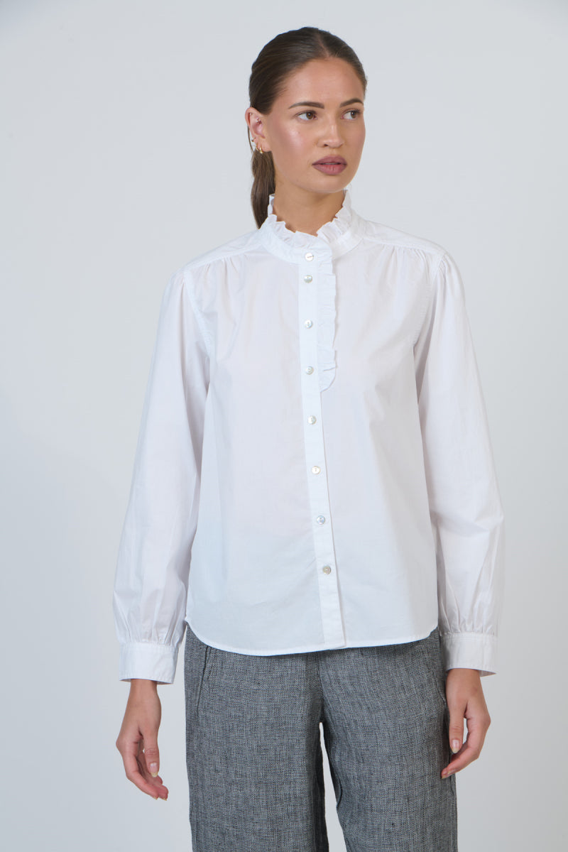 A gorgeous classic white cotton poplin shirt made extra special by a gorgeous frill-collar detail. The frill acts as a stand collar and extends down a quarter of the placket. Finished neatly with mother of pearl buttons.