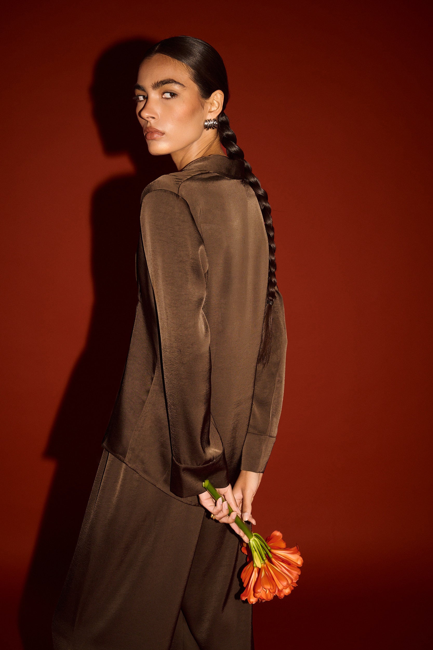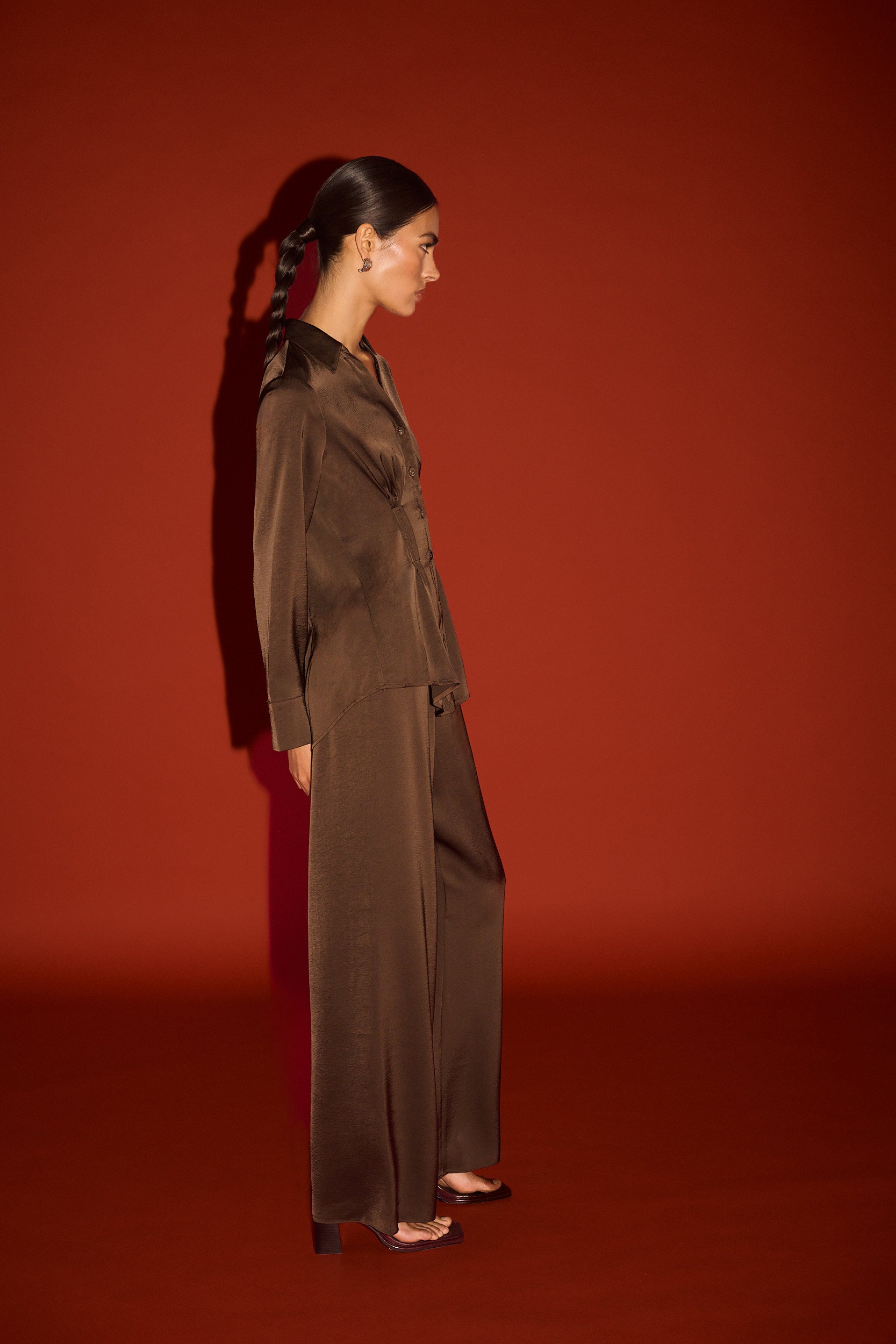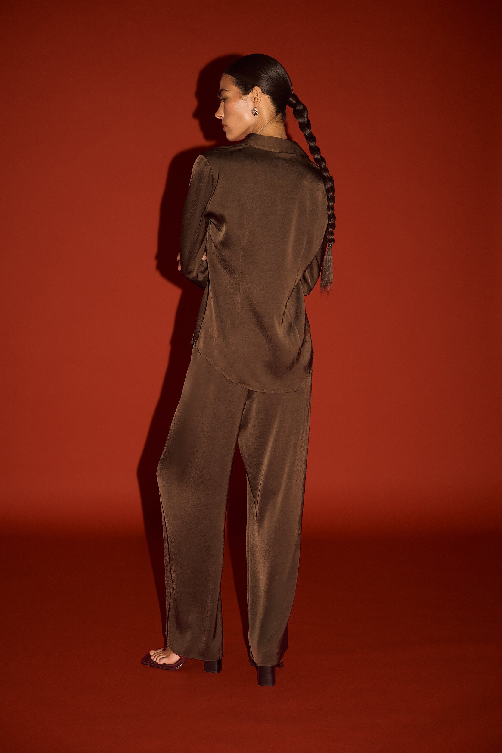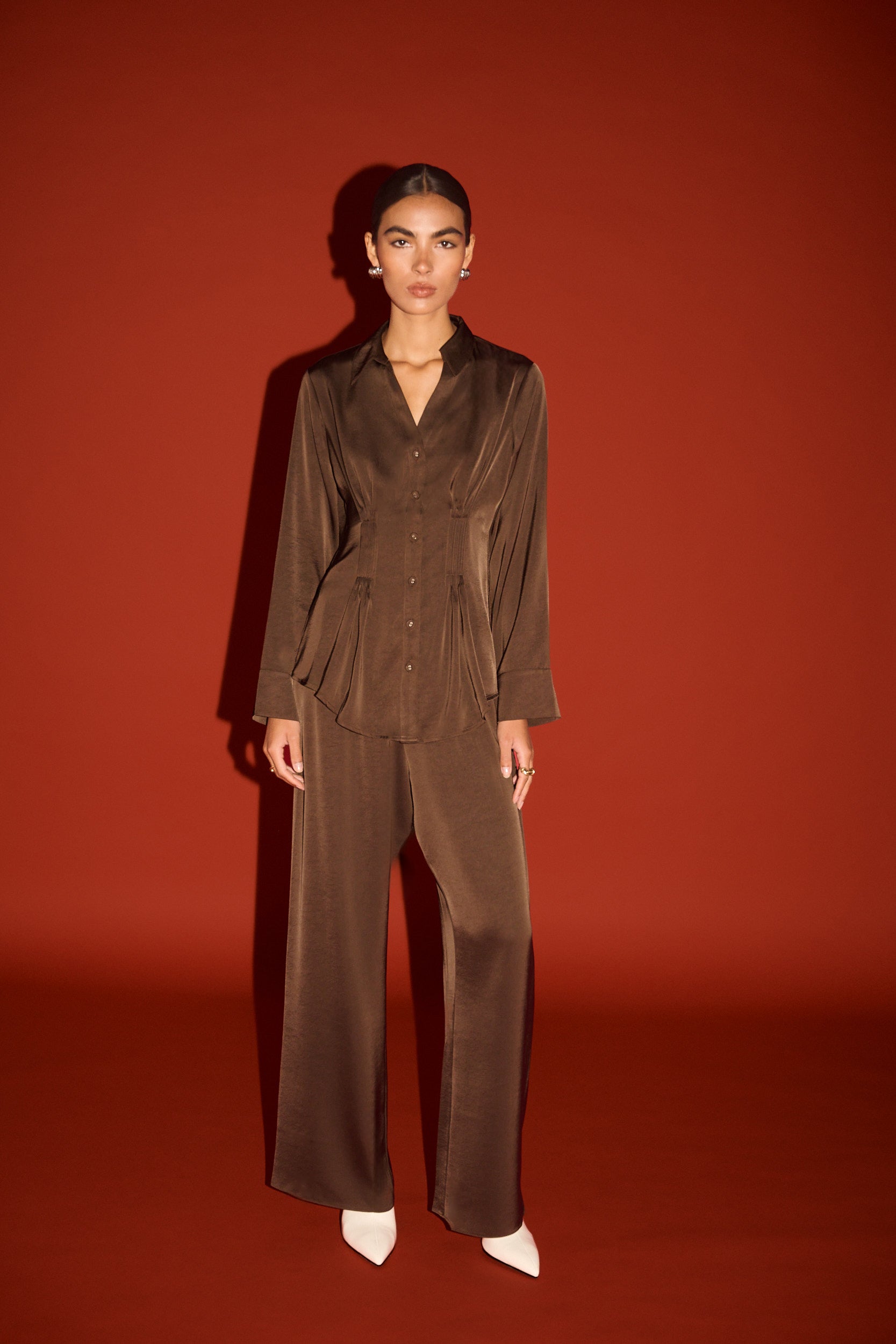 Fluid and refined, the Chocolate Pintuck Cinched Waist Satin Shirt is designed to move with ease while offering a softly structured silhouette. Crafted from a lustrous satin fabrication, it features a classic collar, full button front and subtle waist shaping through panel detailing for a flattering, feminine finish. The rich chocolate hue enhances its depth and sheen, making it a versatile piece for both day and evening styling.