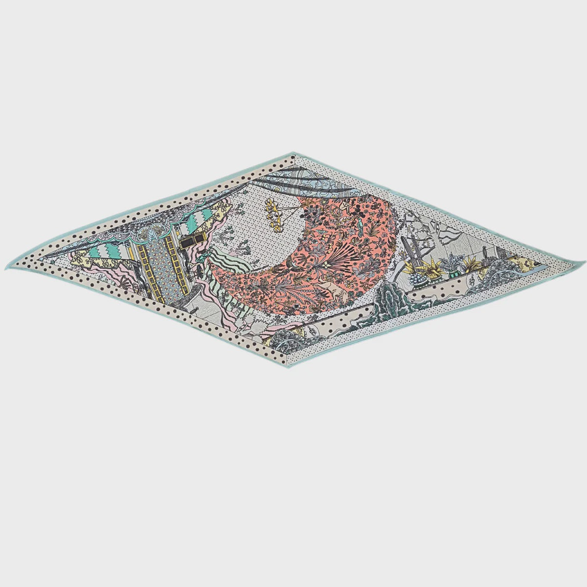 Elegant diamond shaped scarf featuring a pastel pink pattern.