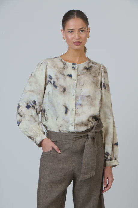 A subtly refined staple for effortless, everyday dressing. The Emperador Shirt is a relaxed 100% linen top featuring a round neckline, a clean button-through front, and full-length sleeves with gathered cuffs. A curved back yoke releases soft gathers for gentle volume, while the hip-length cut keeps the silhouette easy and versatile