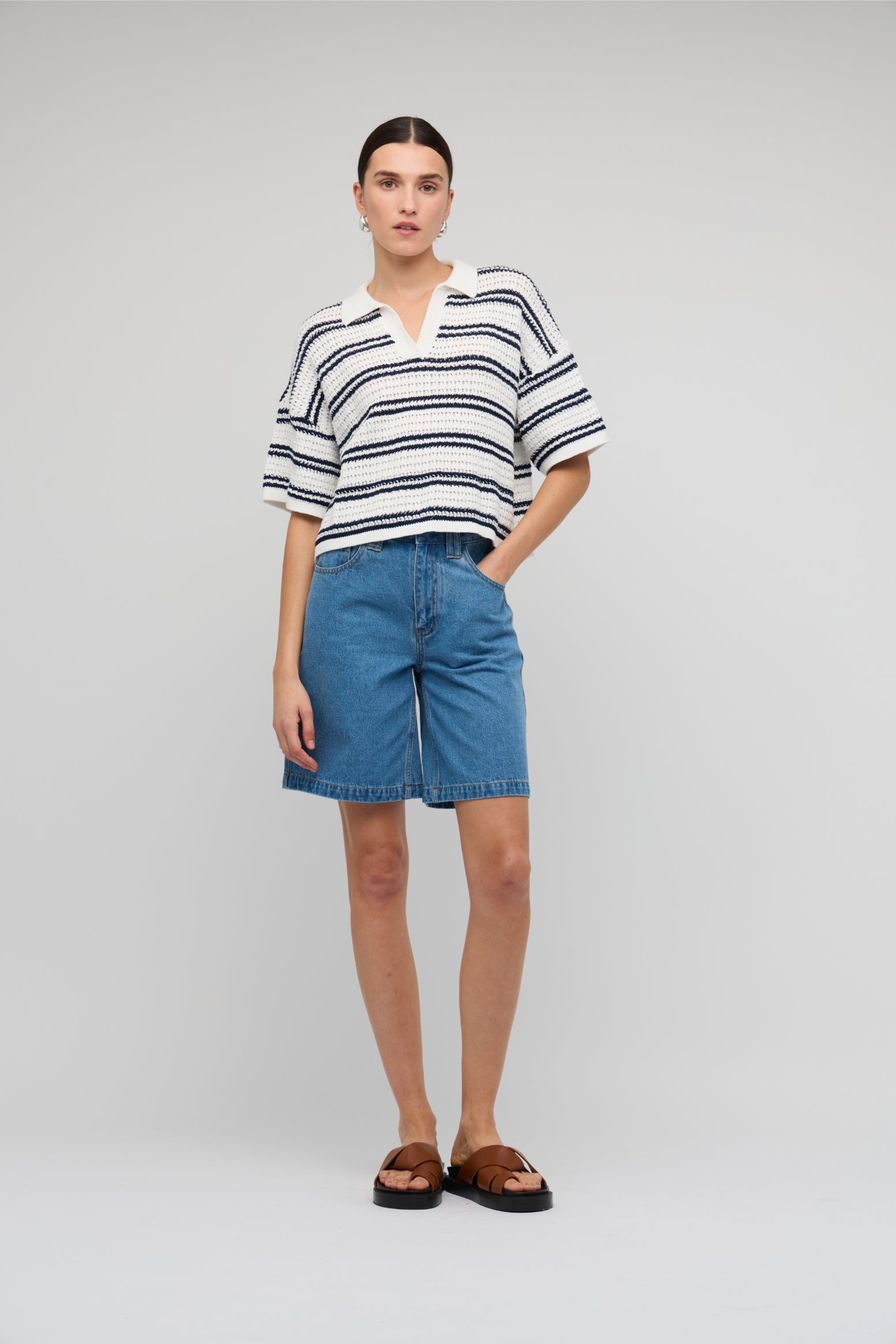 Update your denim rotation with the Cassia Mid Rise Jorts by Staple the Label. Crafted from 100% cotton, these mid-length denim shorts are designed for comfort and versatility. Featuring a relaxed straight cut, classic five-pocket styling, and a washed blue finish, they're the ultimate summer staple. Style them with a crisp white tank, oversized shirt, or slides for effortless off-duty dressing.